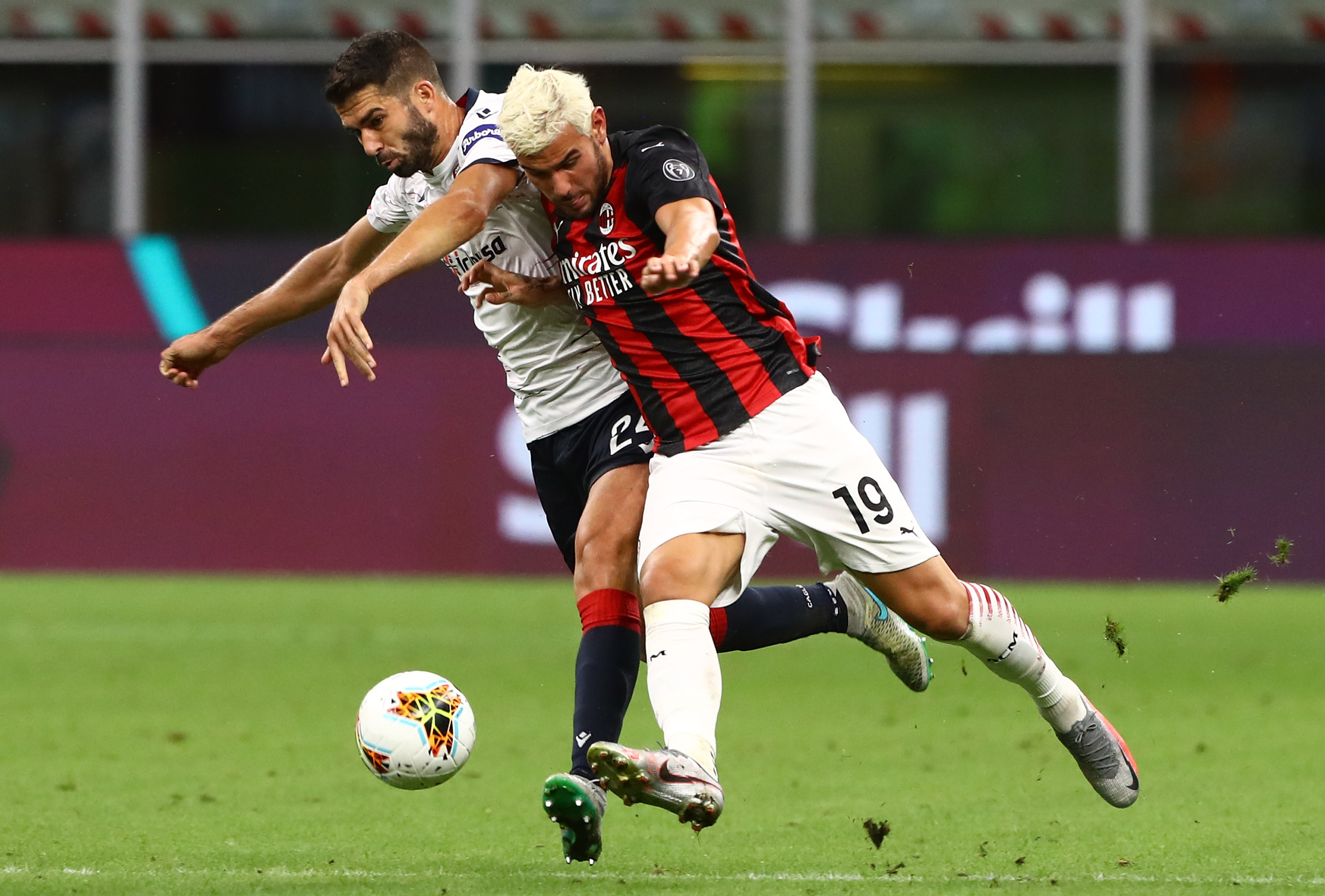 MILAN, ITALY - AUGUST 01: Theo Hernandez (R) of AC Milan competes for the ball with Paolo Farago (L) of Cagliari Calcio during the Serie A match between AC Milan and Cagliari Calcio at Stadio Giuseppe Meazza on August 1, 2020 in Milan, Italy. (Photo by Marco Luzzani/Getty Images)