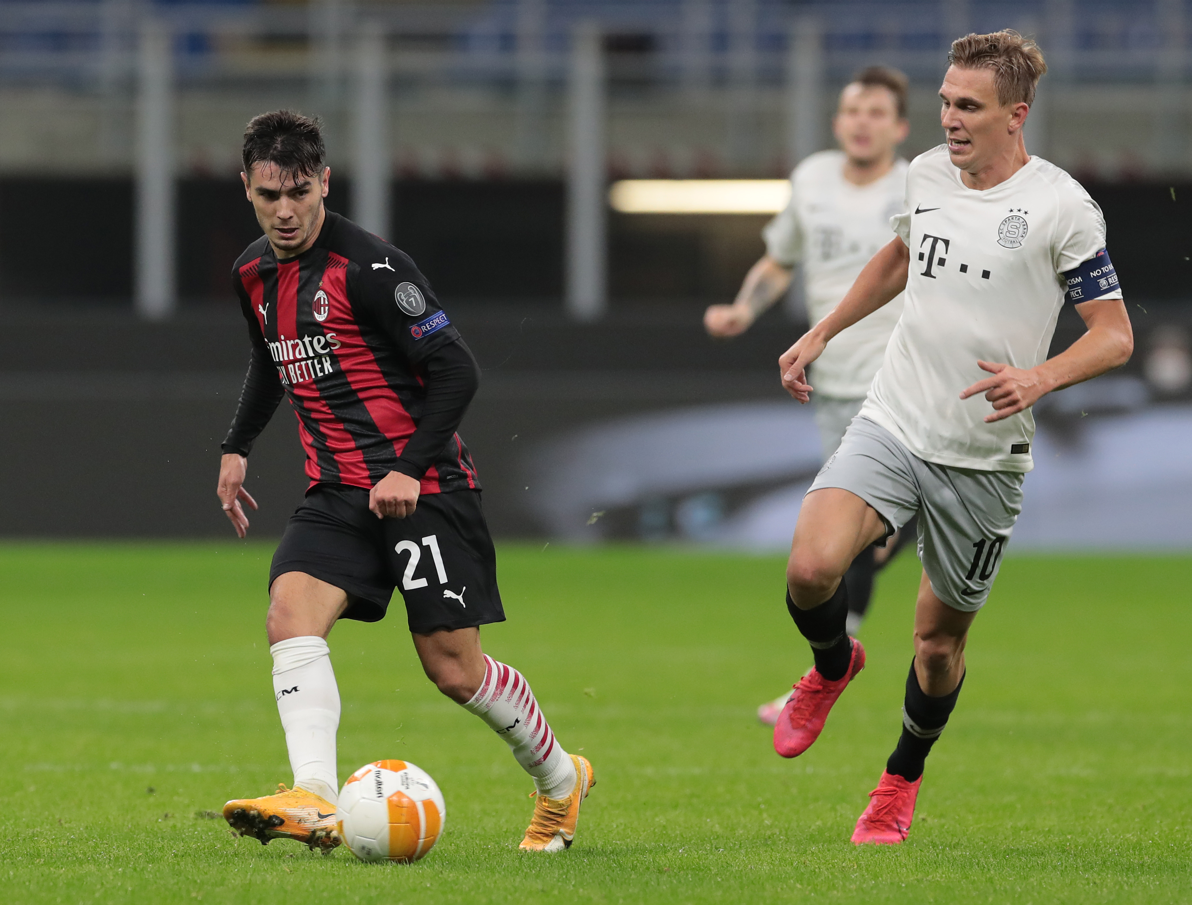MILAN, ITALY - OCTOBER 29: Brahim Diaz (L) of AC Milan is challenged by Borek Dockal of AC Sparta Praha during the UEFA Europa League Group H stage match between AC Milan and AC Sparta Praha at San Siro Stadium on October 29, 2020 in Milan, Italy. (Photo by Emilio Andreoli/Getty Images)