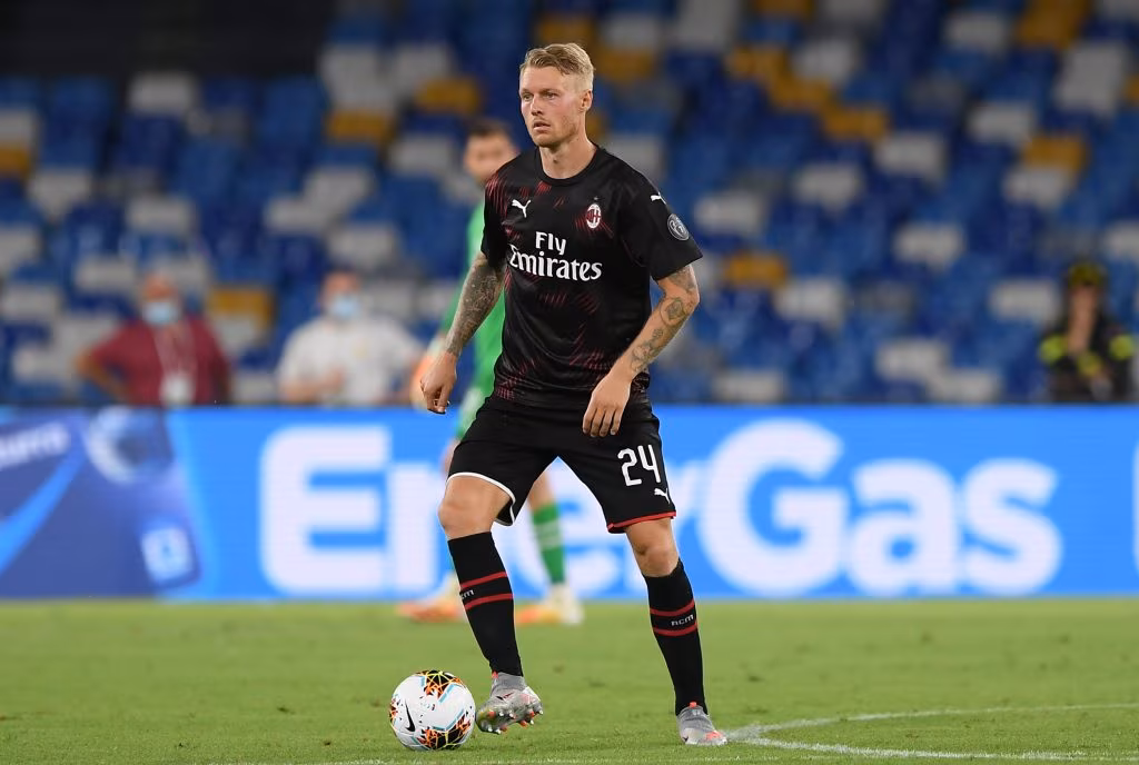 MILAN, ITALY – SEPTEMBER 21: Simon Kjaer (R) of AC Milan competes for the ball with Takehiro Tomiyasu (L) of Bologna FC during the Serie A match between AC Milan and Bologna FC at Stadio Giuseppe Meazza on September 21, 2020 in Milan, Italy. (Photo by Marco Luzzani/Getty Images)