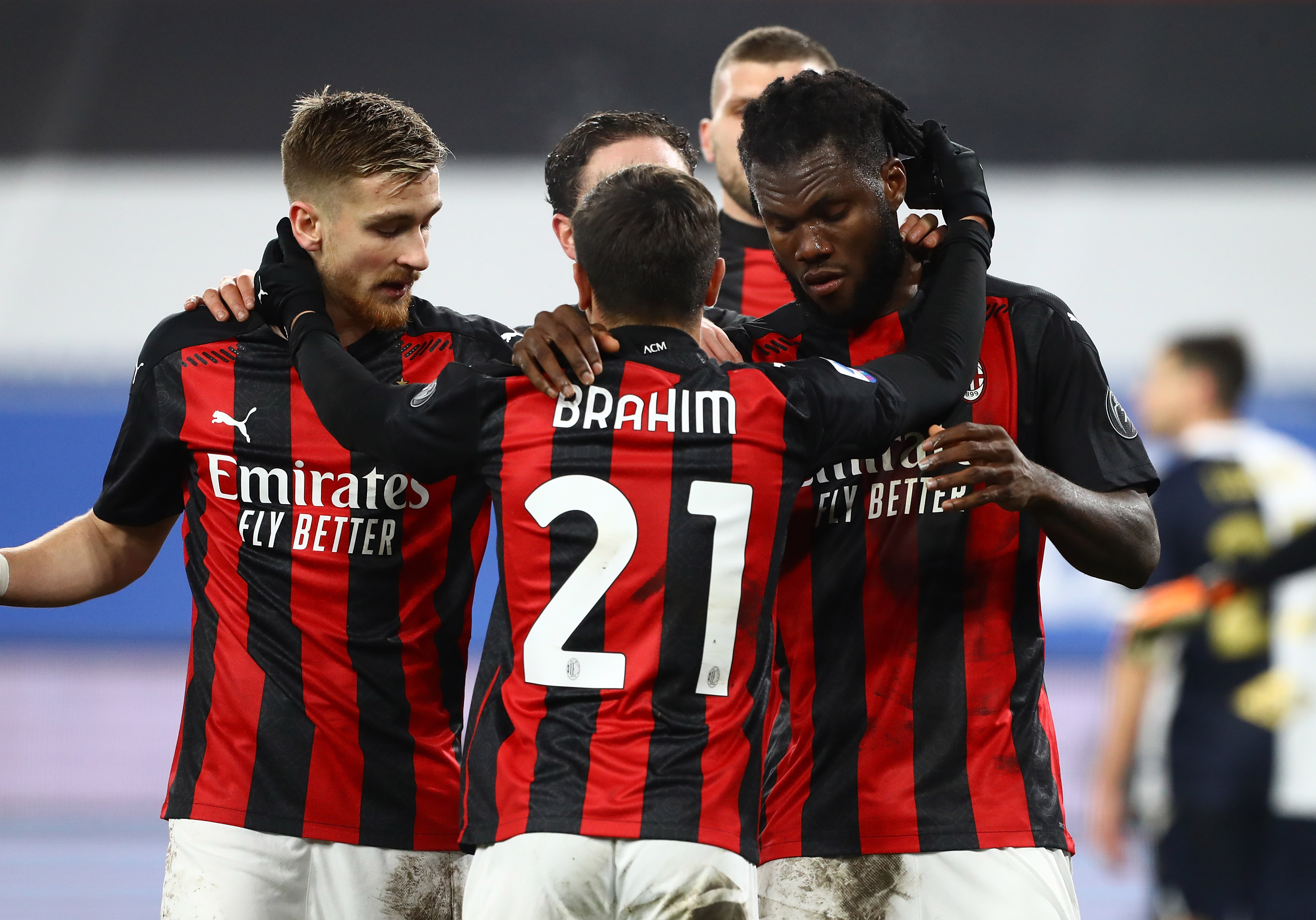 GENOA, ITALY - DECEMBER 06: Franck Kessie (R) of AC Milan celebrates with his team-mates Alexis Saelemaekers (L) and Diaz Brahim (C) after scoring the opening goal during the Serie A match between UC Sampdoria and AC Milan at Stadio Luigi Ferraris on December 6, 2020 in Genoa, Italy. (Photo by Marco Luzzani/Getty Images)