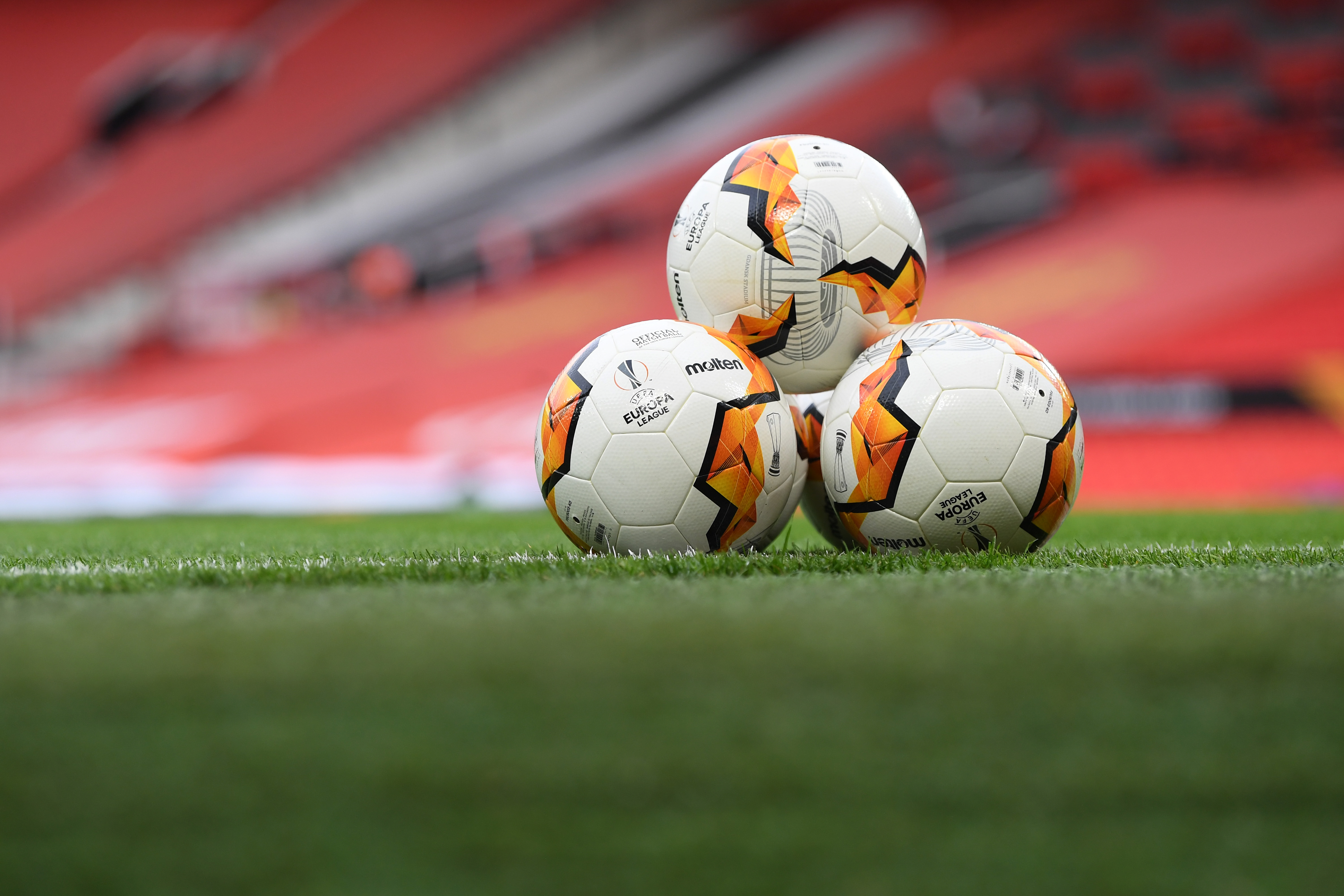 I palloni ufficiali dell'Europa League sul prato dell'Old Trafford di Manchester