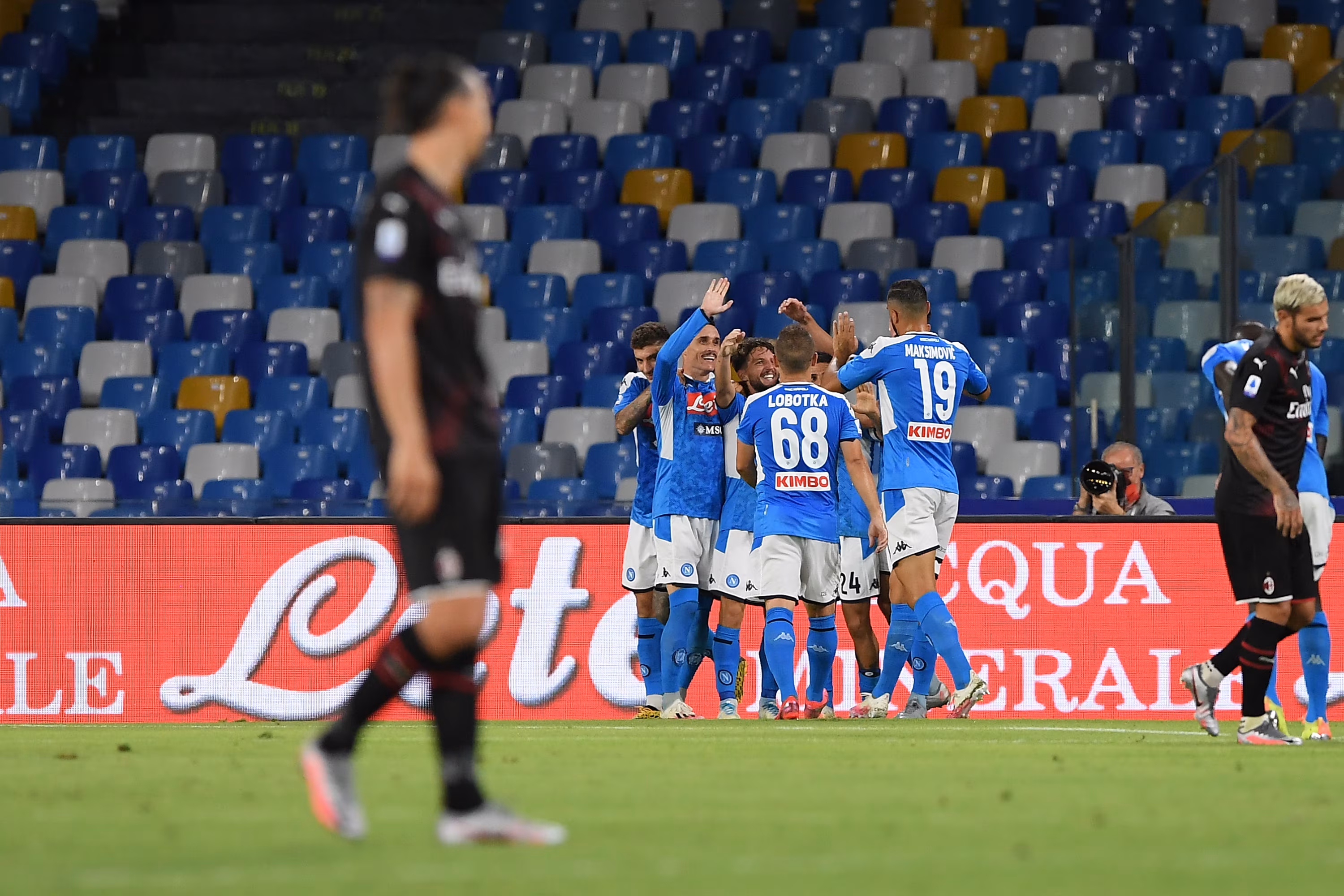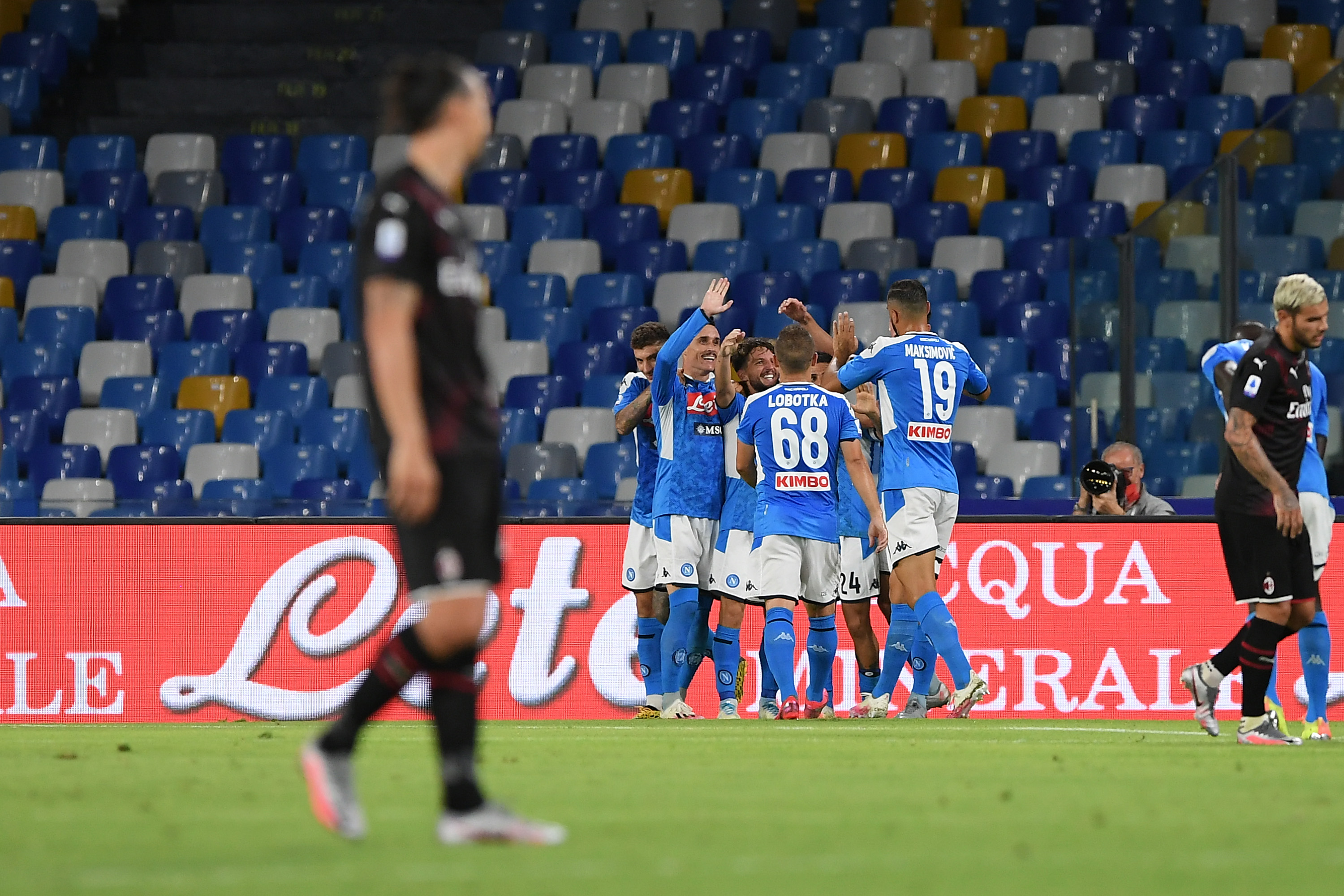 NAPLES, ITALY - JULY 12: SSC Napoli players celebrate the 2-1 goal scored by Dries Mertens, beside the disappointment of Zlatan Ibrahimovic of AC Milan during the Serie A match between SSC Napoli and AC Milan at Stadio San Paolo on July 12, 2020 in Naples, Italy. (Photo by Francesco Pecoraro/Getty Images)