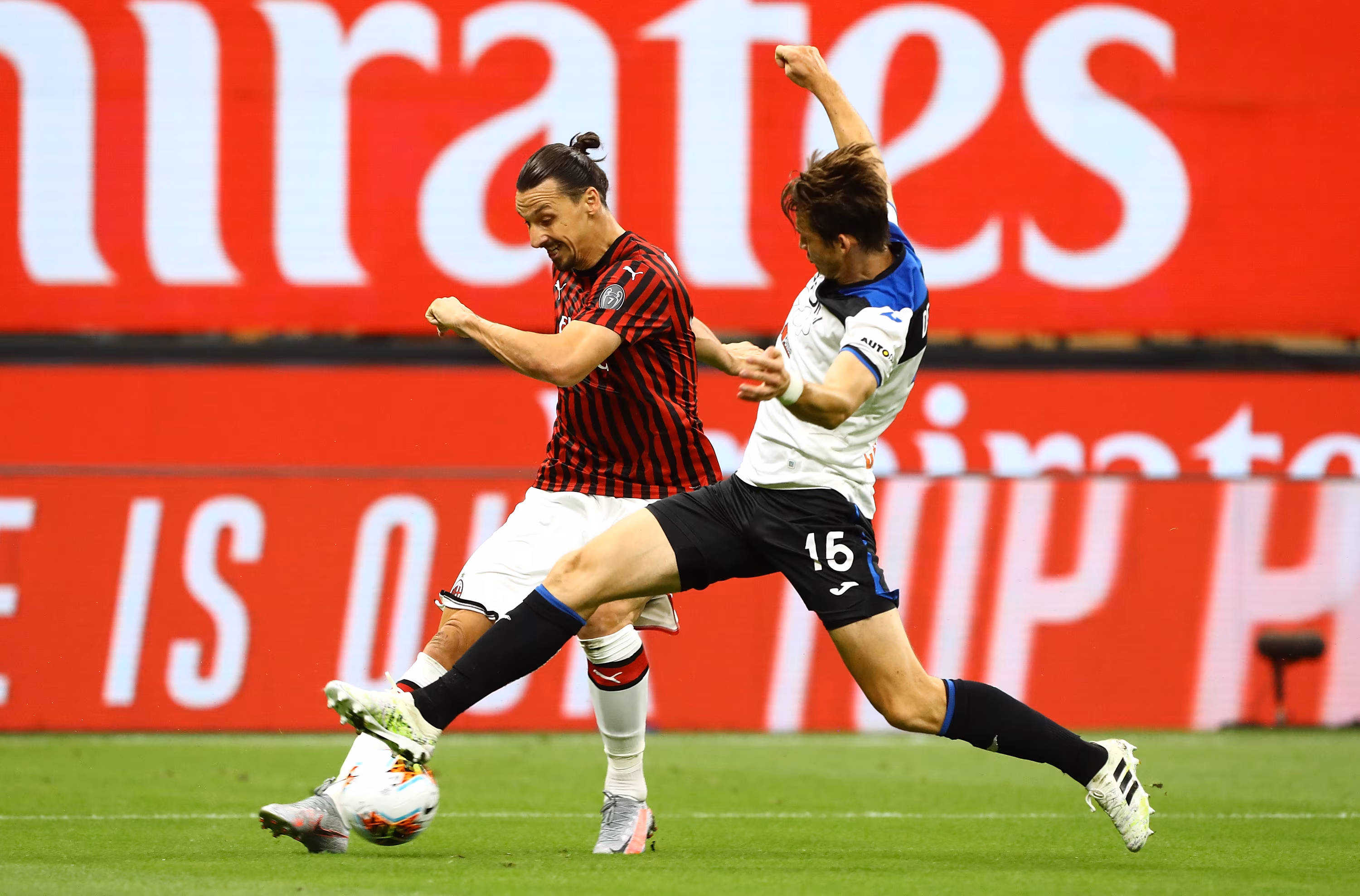 Marteen De Roon, centrocampista dell'Atalanta, contrasta Zlatan Ibrahimovic, attaccante del Milan