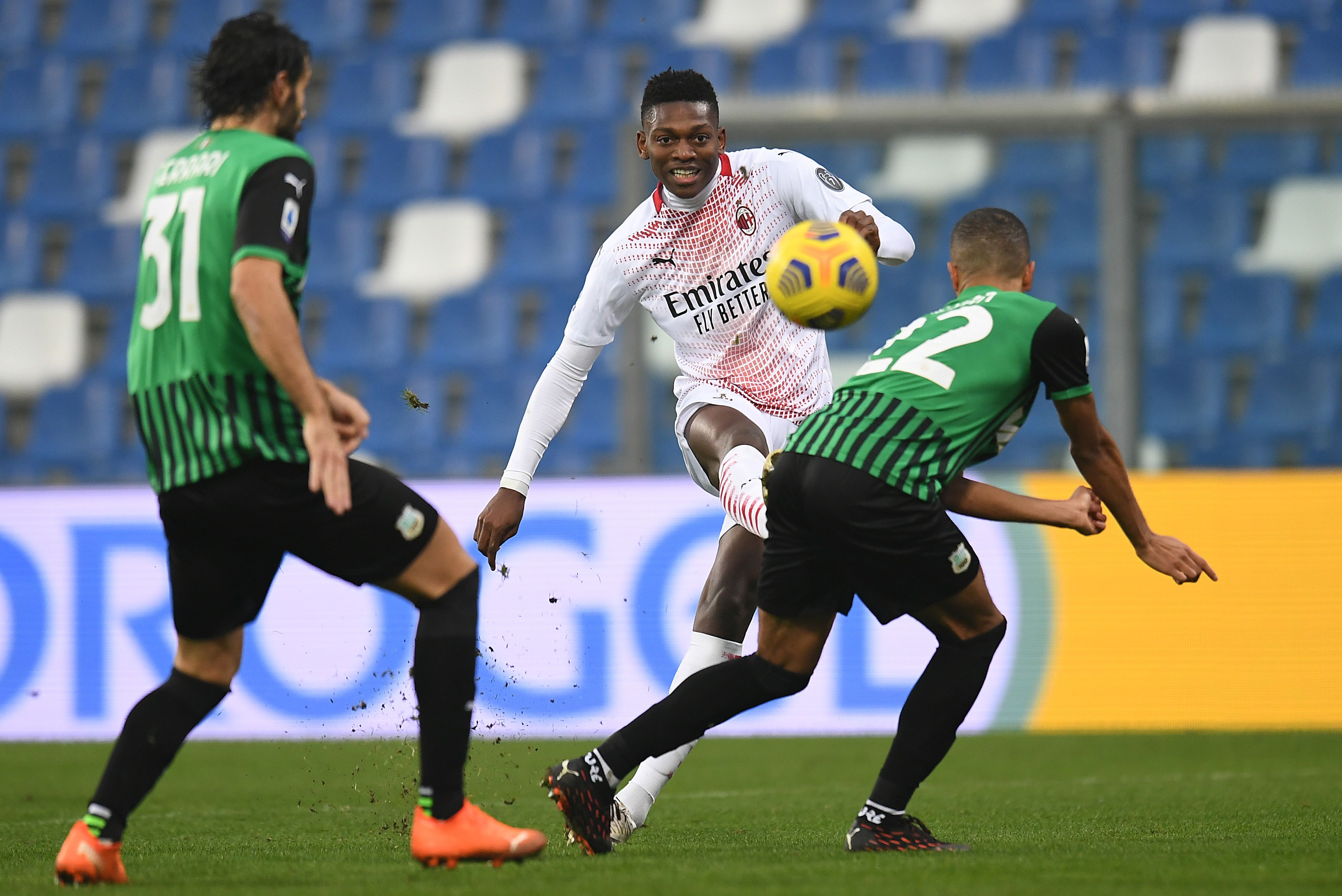 Rafael Leao del Milan al tiro contro il Sassuolo